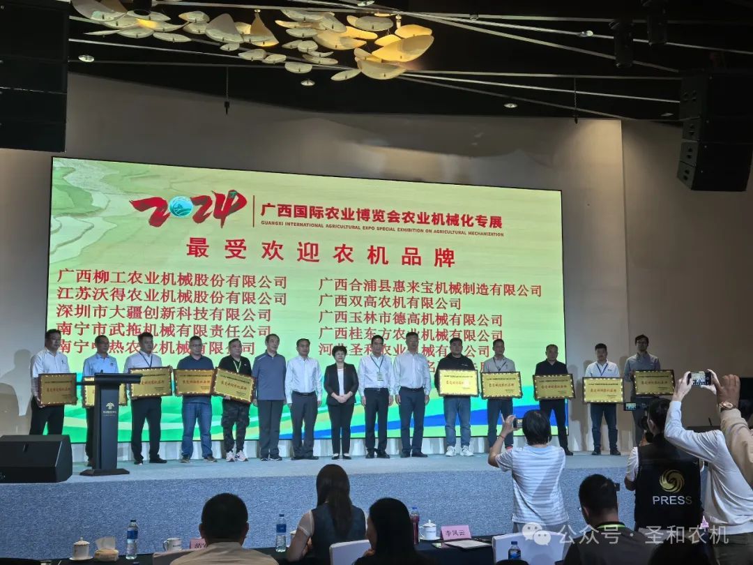 為大力宣傳和推介近年來在促進廣西農業機械化發展中受市場認可、用戶歡迎的農機企業(品牌)和產品,營造“制好機、選好機、用好機”的農機化良性發展環境和社會氛圍。廣西國際博覽集團有限公司與廣西農業機械化協會自2024年10月就開始組織了“2024廣西國際農業博覽會農業機械化專展最受歡迎農機品牌”評選活動。在激烈的評選競爭中,“圣和”品牌不負眾望,最終斬獲“2024廣西國際農業博覽會農業機械化專展最受歡迎農機品牌”榮譽稱號。在博覽會期間,圣和公司申江卓經理代表公司出席頒獎儀式,并上臺領獎。